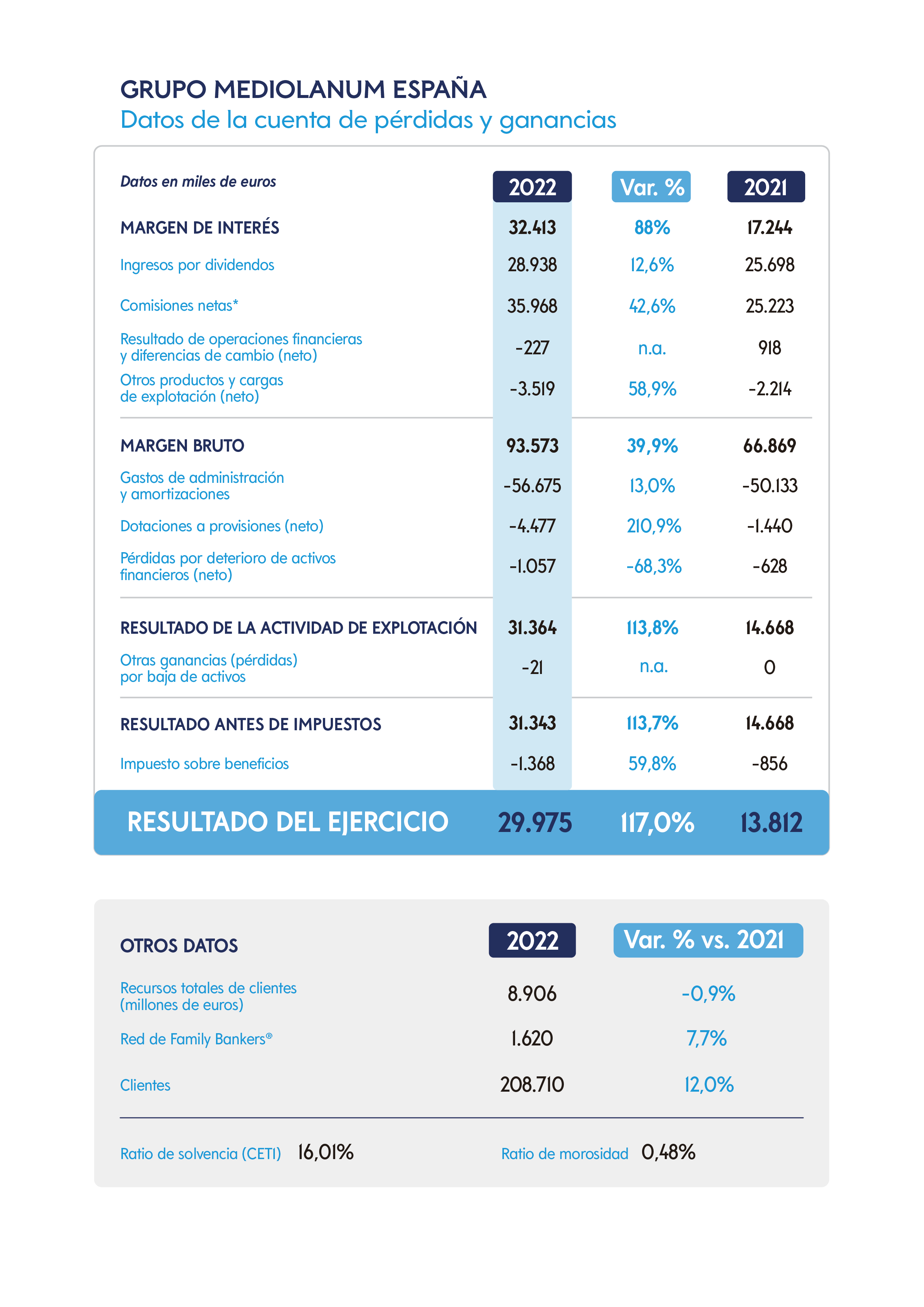 Por su parte, el Grupo Mediolanum —del que forma parte Banco Mediolanum— logró en 2022 un beneficio neto consolidado de 521,8 millones de euros, un 27% menos que el año anterior.