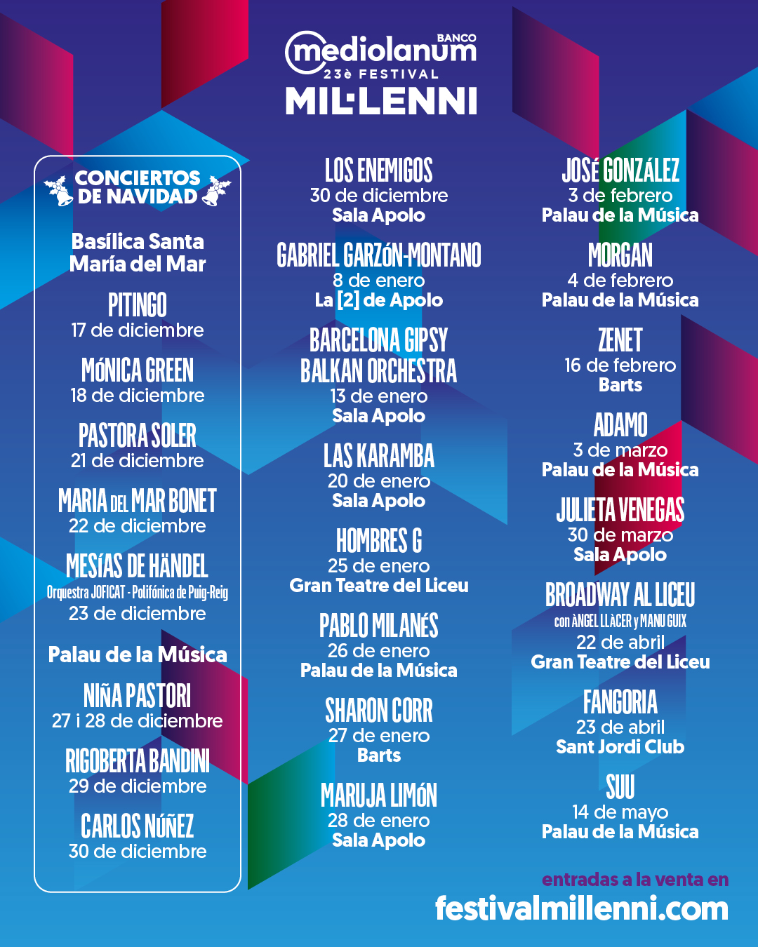 Este 2021, el festival presenta bajo el nombre de Banco Mediolanum Festival Mil·lenni más de 25 conciertos que llenarán de música las principales salas de Barcelona como el Palau de la Música Catalana, el Gran Teatre del Liceu, la Sala Apolo o el Sant Jordi Club.