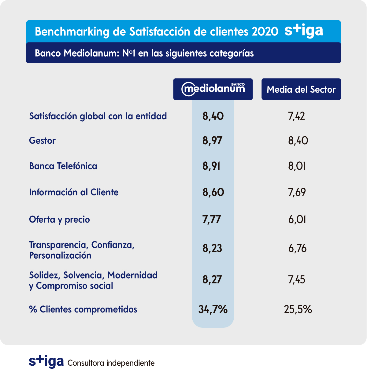 Como en la anterior edición, Banco Mediolanum es el primer banco en el ranking de satisfacción global de clientes con su entidad de toda la banca española. Un 8,40 sobre 10, lo que supera la media del sector (7,42).