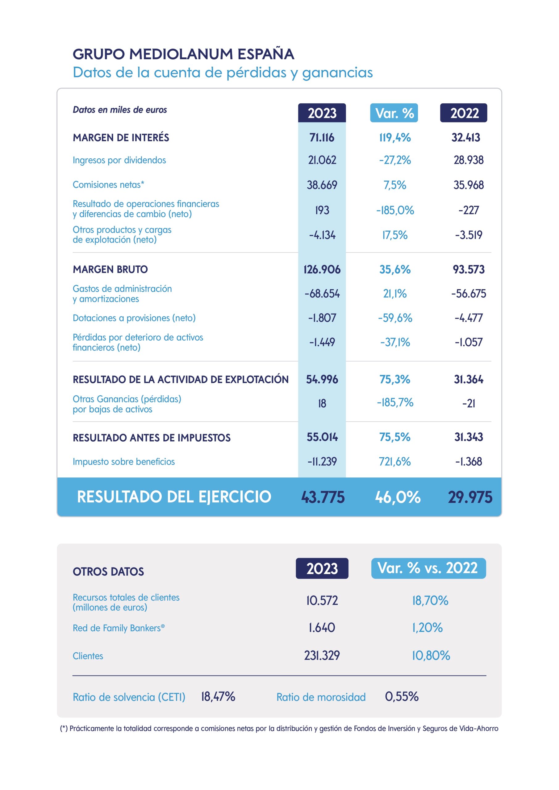 “A pesar de los retos y los desafíos que ha planteado 2023, hemos logrado seguir creciendo en todos los ámbitos e incluso alcanzar cifras récord en patrimonio, número de clientes, resultado, ingresos, créditos, fondos y protección. Unos logros que avalan nuestro modelo de negocio y nos permiten continuar invirtiendo de forma decidida en nuestra estructura y desarrollo para seguir mejorando el asesoramiento y la gama de servicios y productos que ofrecemos a nuestros clientes y el apoyo y las herramientas a disposición de nuestra red de Family Bankers”.