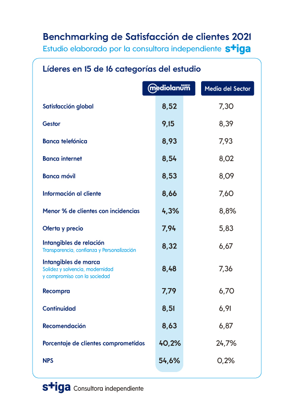 Según el estudio 2021, Banco Mediolanum encabeza, una vez más, el ranking de satisfacción global de los clientes con su entidad en España. Y, además, con mejor nota que la edición anterior. Un 8,52 sobre 10 frente al 7,30 de media del sector, superando la nota obtenida en el estudio de 2020 (que fue de un 8,40).